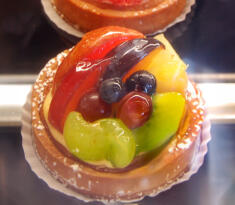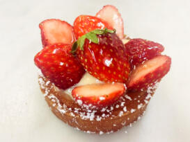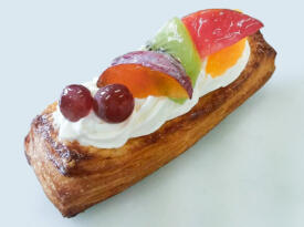 クロワッサン生地にカスタードクリームを絞って焼いた台にカスタードクリームと生クリーム季節の果物。